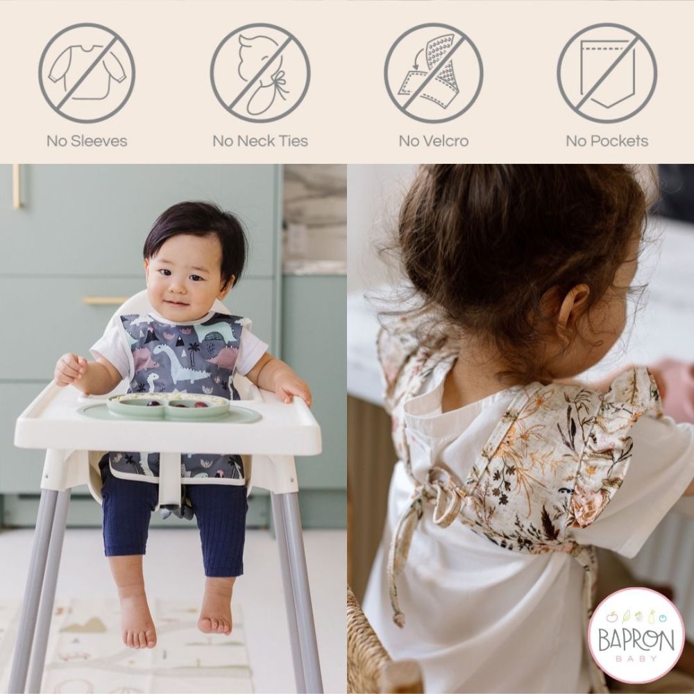 This best-selling “Bapron”, also known as a bib-apron hybrid, full-coverage bib, smock, or apron. Specifically designed for children who dislike traditional bibs that tie around the neck, and who are self-feeding at an early age (baby led weaning). Our baprons safely secure around your little ones body, rather than the neck. Making it pretty much impossible to pull off without adult assistance.